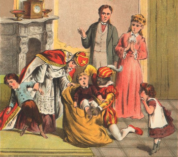 ![]() | Pictured: Zwarte Piet ("Black Pete") assisting Sinterklaas by bagging naughty children in the Netherlands as gifts for cannibal tribes in faraway lands. Although not as terrifying as his cousins Krampus or Belsnickle, he is far more offensive. Depicted as a bumbling Spanish Moor who helps St. Nicholas haul his bag of gifts around and punish those who didn't make the nice list, Zwarte Piet is essentially a slave. Because of this, blackface in the Netherlands is a holiday tradition, which the UN has now asked them kindly to cease and desist. Illustration by Jan Schenkman, 1850, Wikimedia Commons. | |